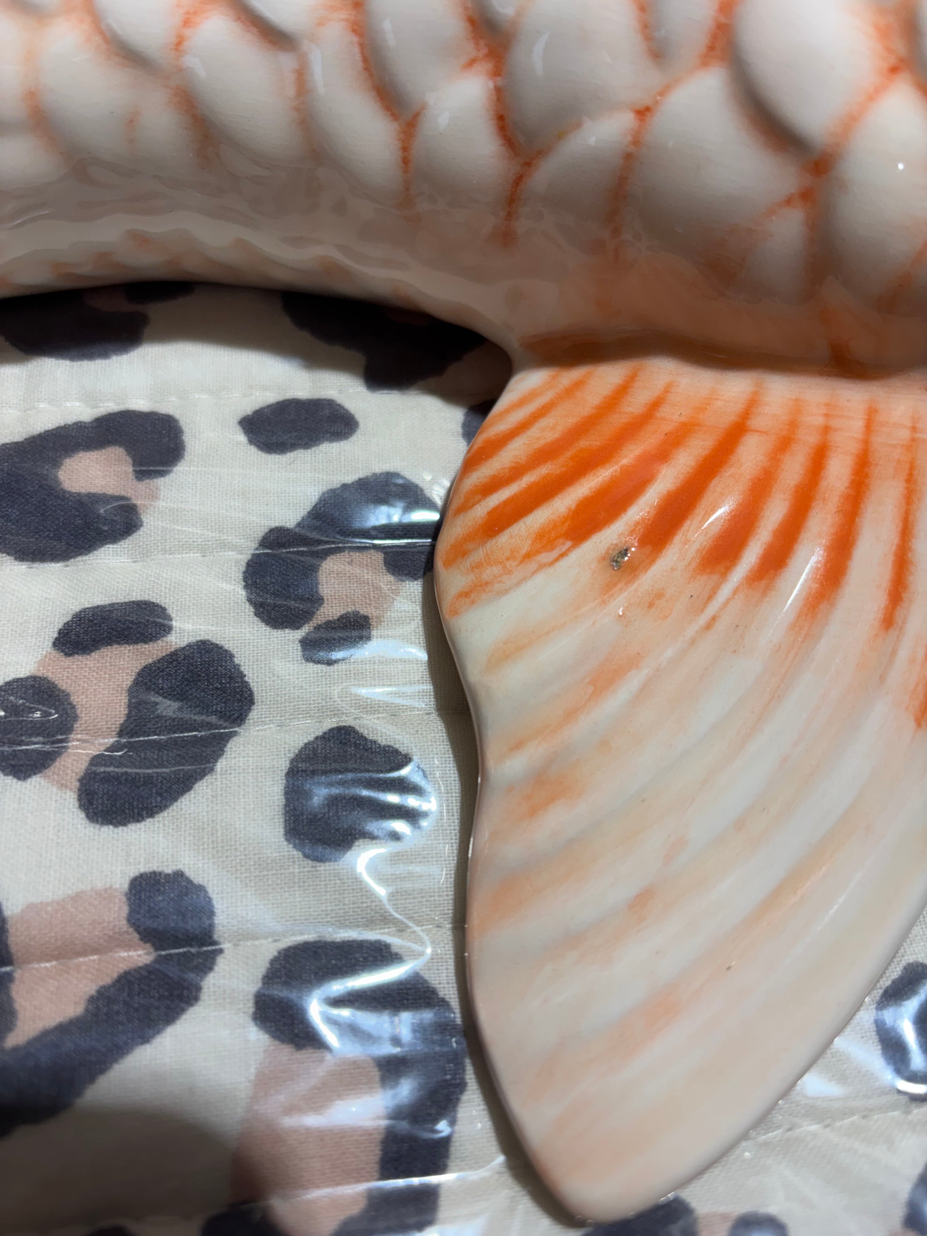 Karpen et lille fejl i glasuren på den ene finne. Se billede.