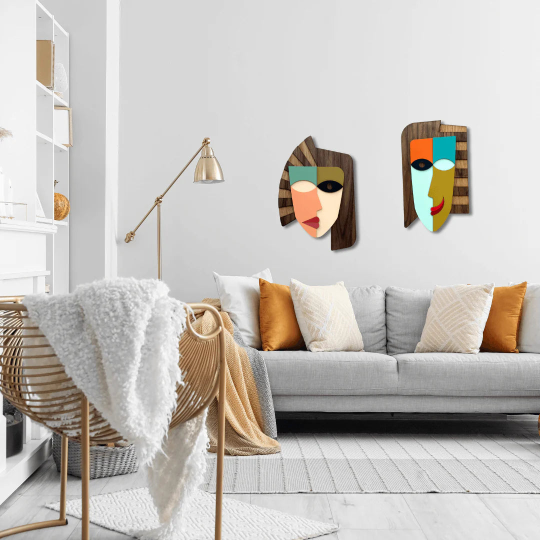 Oplev den unikke charme ved den abstrakte maske fra Umasqu. Hver maske er håndmalet med stor omhu og har sin egen karakter, hvilket gør den til et særligt kunstværk, der kan pryder væggene i dit hjem.