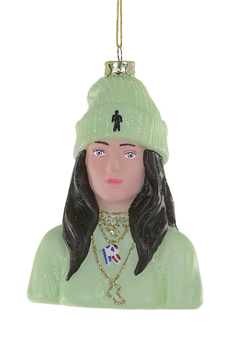 Dette charmerende ornament af den populære amerikanske sangerinde og sangskriver Billie Eilish bringer et unikt touch til din juleudsmykning. Håndmalet og detaljeret, vil dette ornament lyse op blandt dine julekugler og tilføje en personlig dimension til din julefejring.