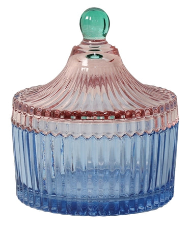 Denne smukke bonbonniere i blå og rosa striber er den perfekte opbevaringsløsning til dine yndlingsgodbidder. Den fine glas krukke med låg tilføjer et strejf af elegance til ethvert rum og er ideel til både dekoration og funktionalitet.