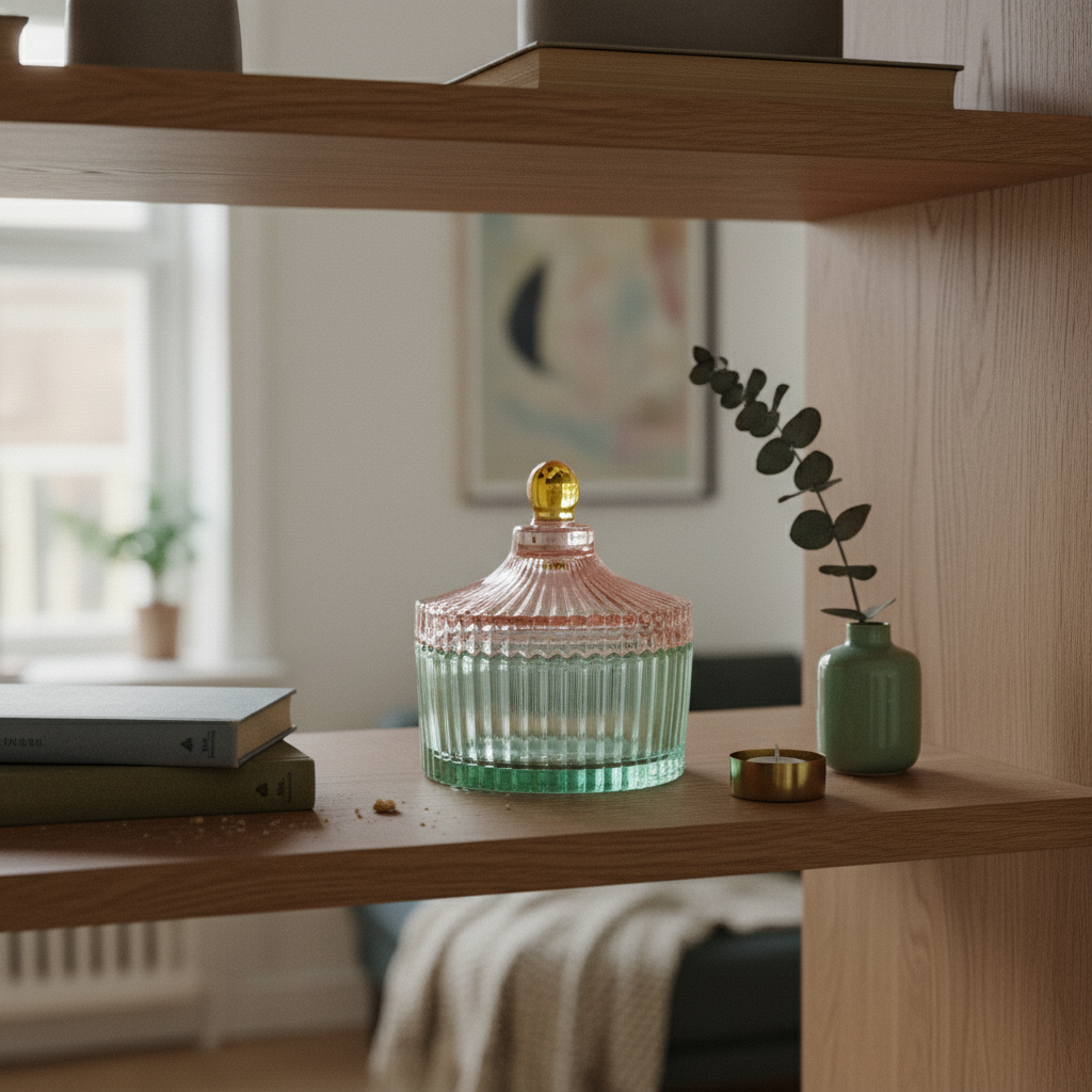 Ud over den praktiske funktion fungerer bonbonnieren som et dekorativt indslag i boligen. De fine striber skaber en visuel interesse, mens farvekombinationen tilfører et friskt, moderne præg. Brug den som et selvstændigt pyntelement eller som del af en større stillebenskomposition.