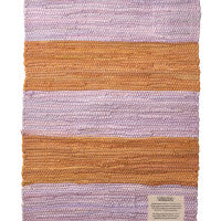 Tæppet er skabt med en blød, tekstureret overflade og et stribet mønster i komplementære farver, afsluttet med matchende kvaster. Det kan anvendes i forskellige rum som indgangen, stuen eller sommerhuset for at tilføje varme og karakter til indretningen.