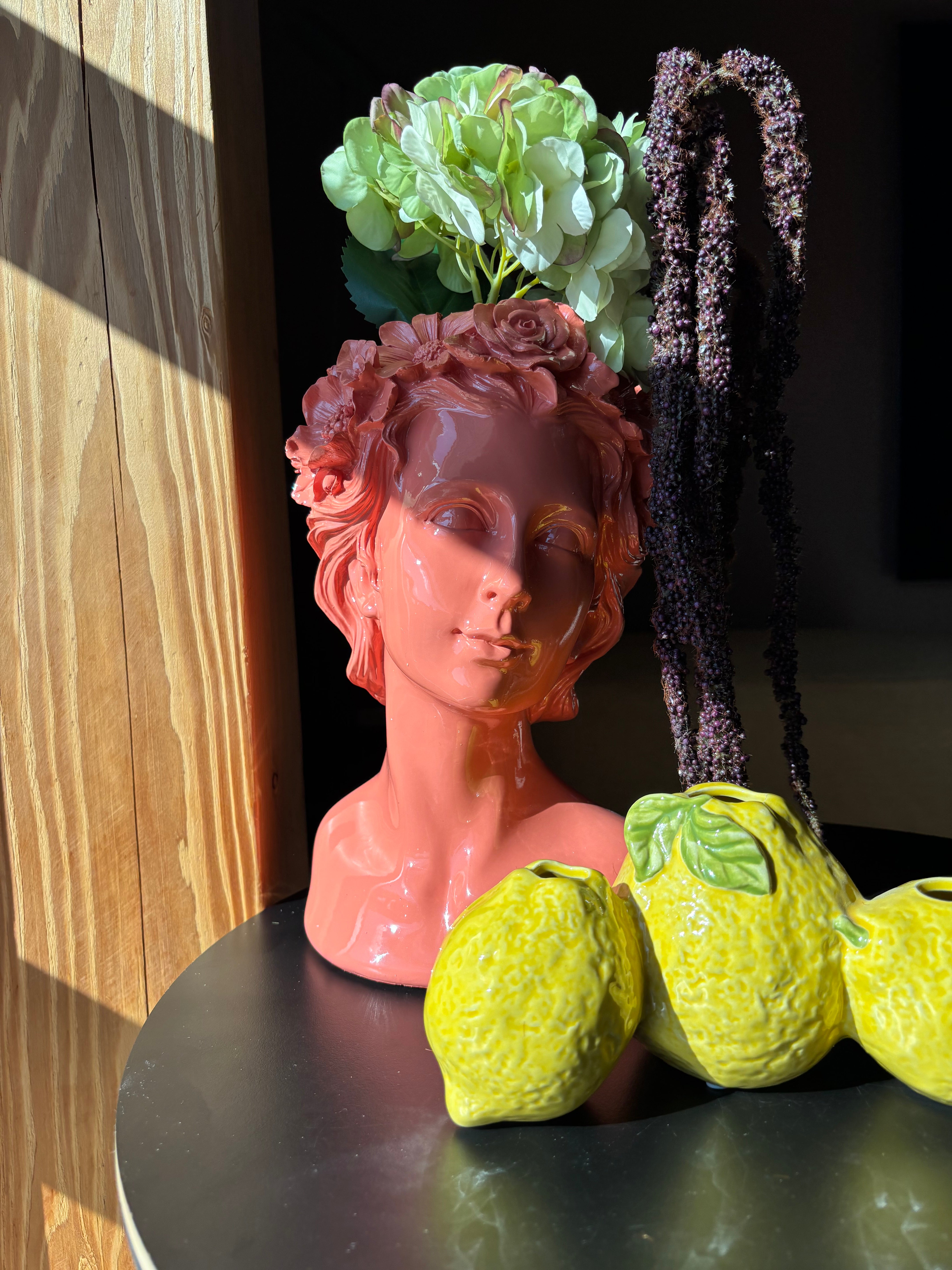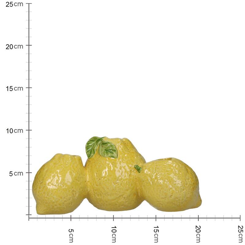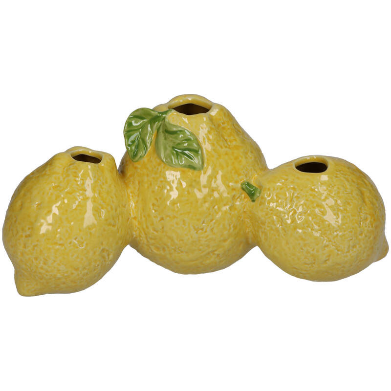 Den gule citronvase fungerer som et naturligt blikfang, der lyser rummet op. Keramikken giver vasen en holdbar kvalitet, mens det kunstneriske design gør den til et samtaleemne. Den kan bruges både til friske blomster eller stå som et dekorativt element på hylden, kommoden eller spisebordet.