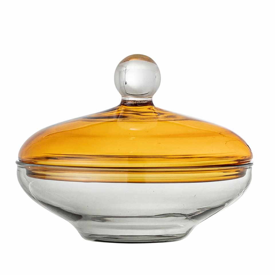 Danni krukken i glas fra Bloomingville er en elegant og funktionel opbevaringsløsning, der tilføjer et strejf af farve til dit køkken eller stue. Med sit glade gule låg og bløde, kurvede form er denne krukke perfekt til at opbevare småting eller snacks, alt imens den pynter i rummet.