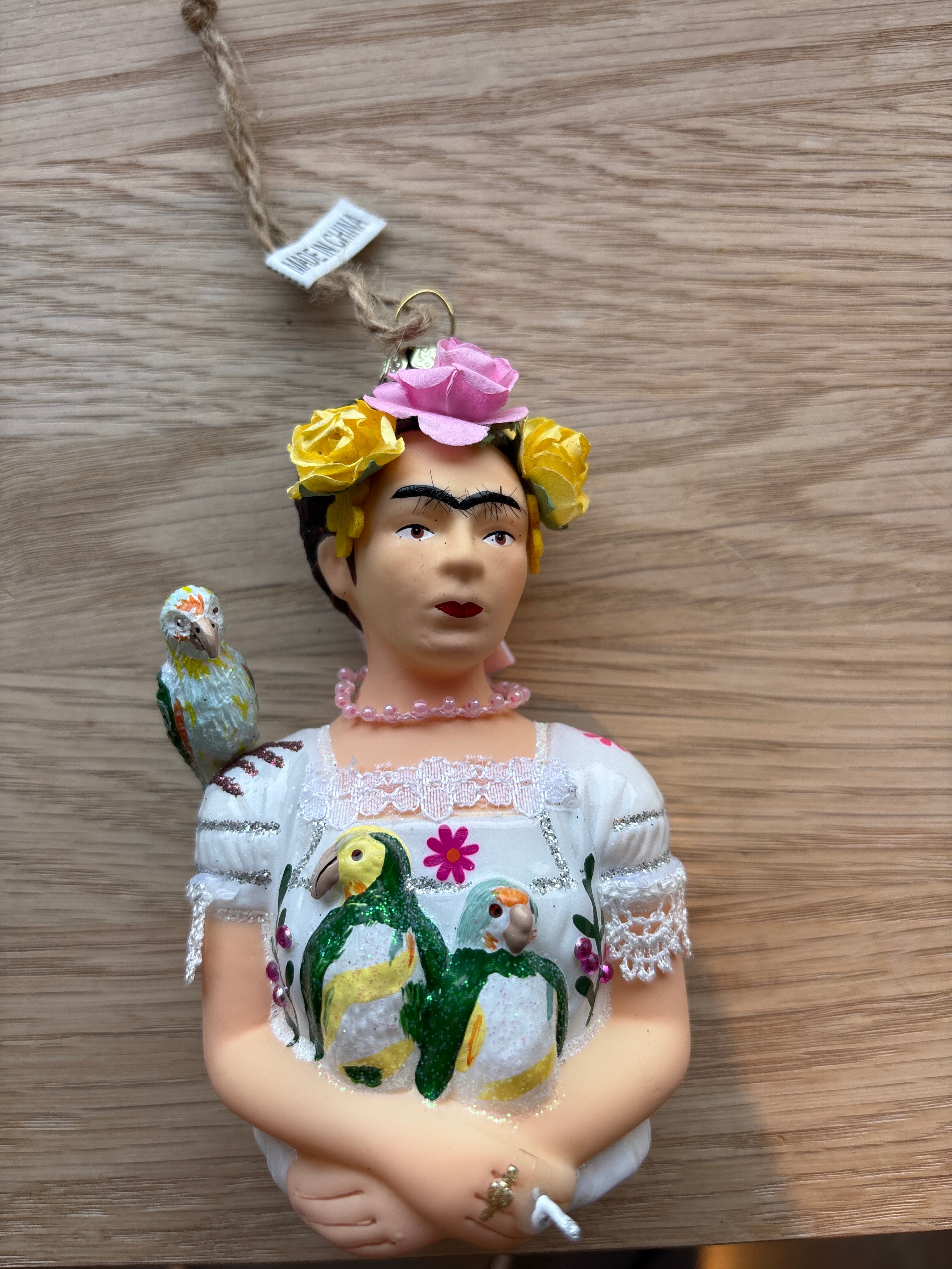 Dette farverige Frida Kahlo ornament med papegøjer er fremstillet i glas og måler 11,4 cm i højden. Det håndmalede kunstværk fra Cody Foster er designet med inspiration fra den verdensberømte mexicanske kunstner og kan bruges både som julepynt og som en kunstnerisk detalje i hjemmet året rundt.