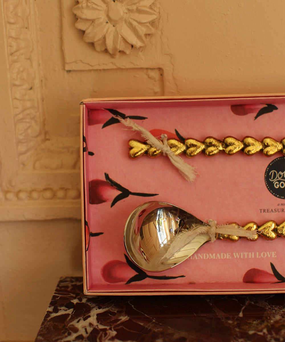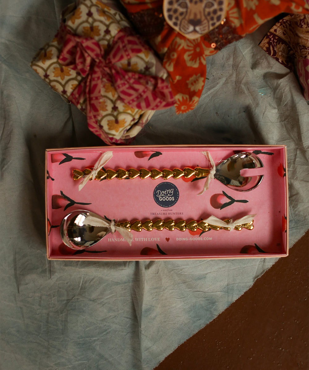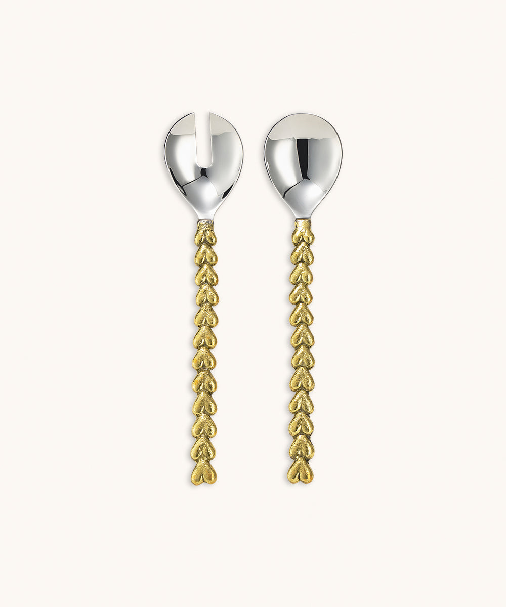Hjerte salatbestik fra Doing Goods er det perfekte valg til dem, der ønsker at gøre enhver salatpræsentation til en fest. Dette smukke sæt indeholder en salatske og en salatgaffel, begge med elegante håndtag dekoreret med en række delikate gyldne hjerter. Hver del er håndlavet af genanvendt messing og rustfrit stål af høj kvalitet, hvilket gør dem til ægte blikfang ved enhver lejlighed.