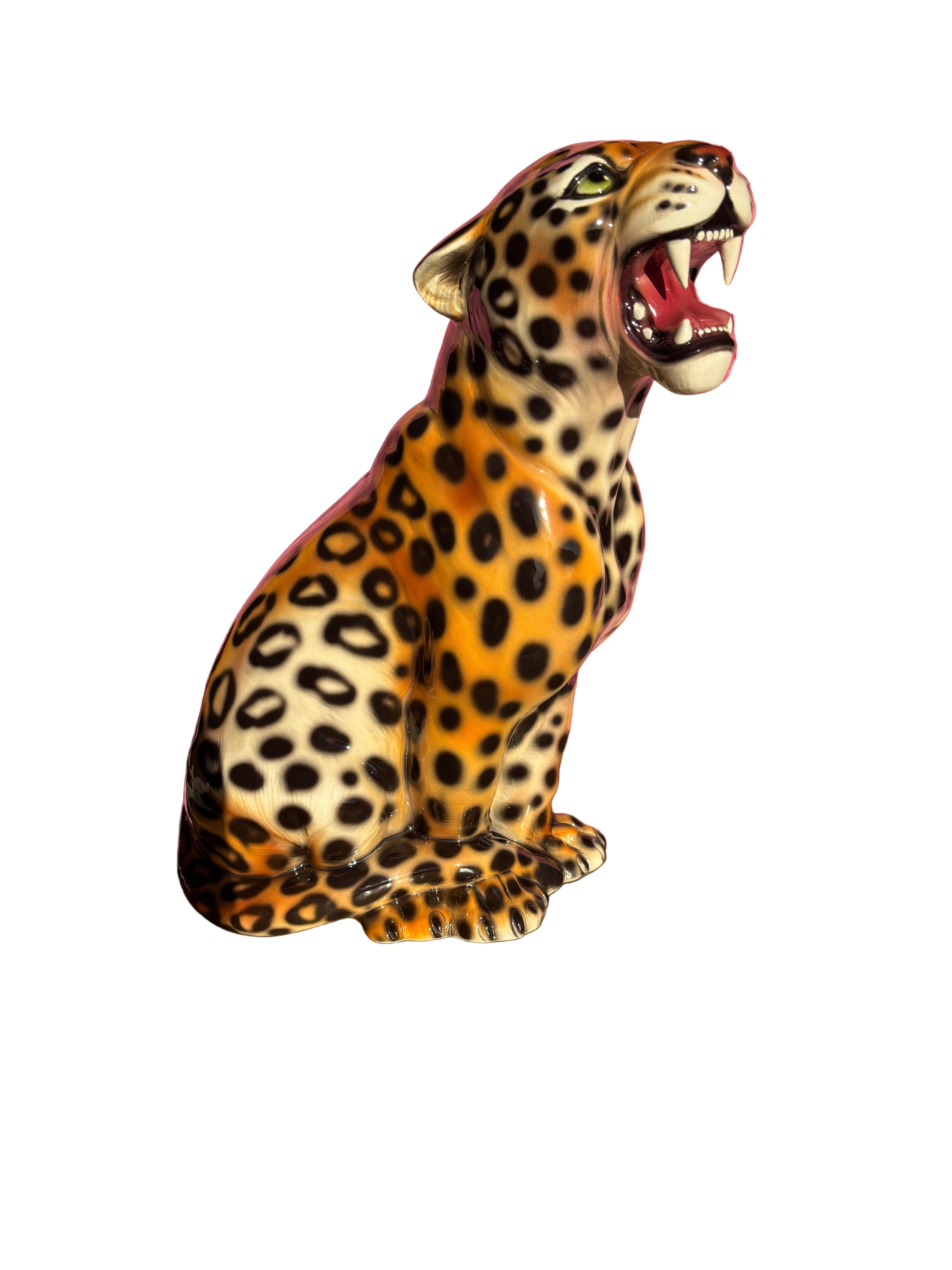 Denne 45 cm høje leopardfigur i 90'er-stil er håndmalet på en italiensk porcelænsfabrik med over 30 års erfaring. Den imponerende figur tilføjer personlighed og karakter til din indretning, hvad enten den vogter entréen eller skaber junglestemning ved stueplanterne. Hver figur har sit eget unikke håndmalede mønster, hvilket gør den til et særligt indretningselement.