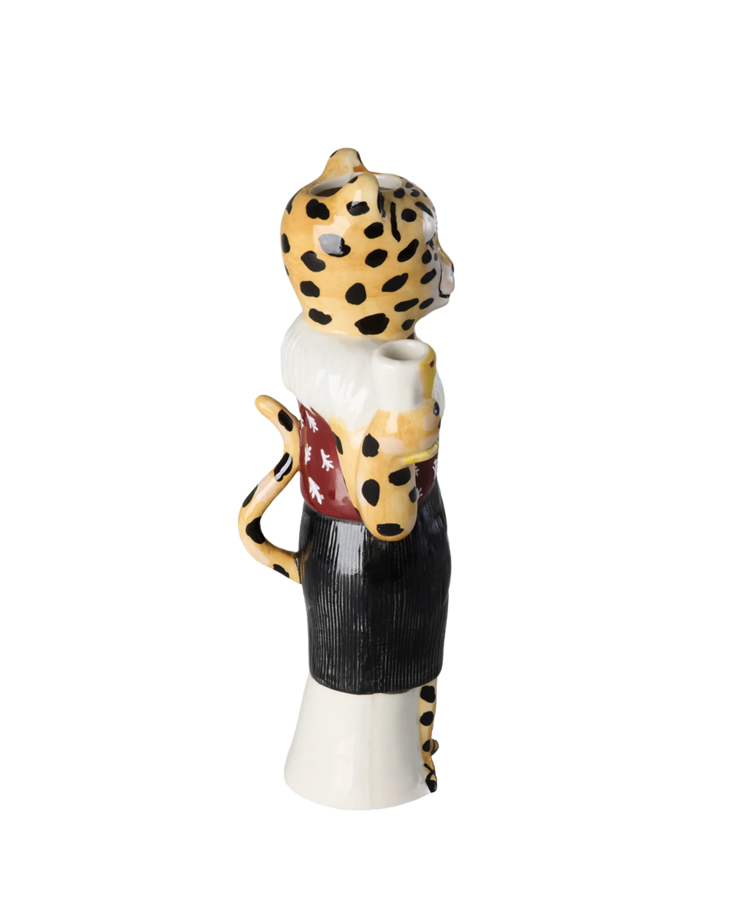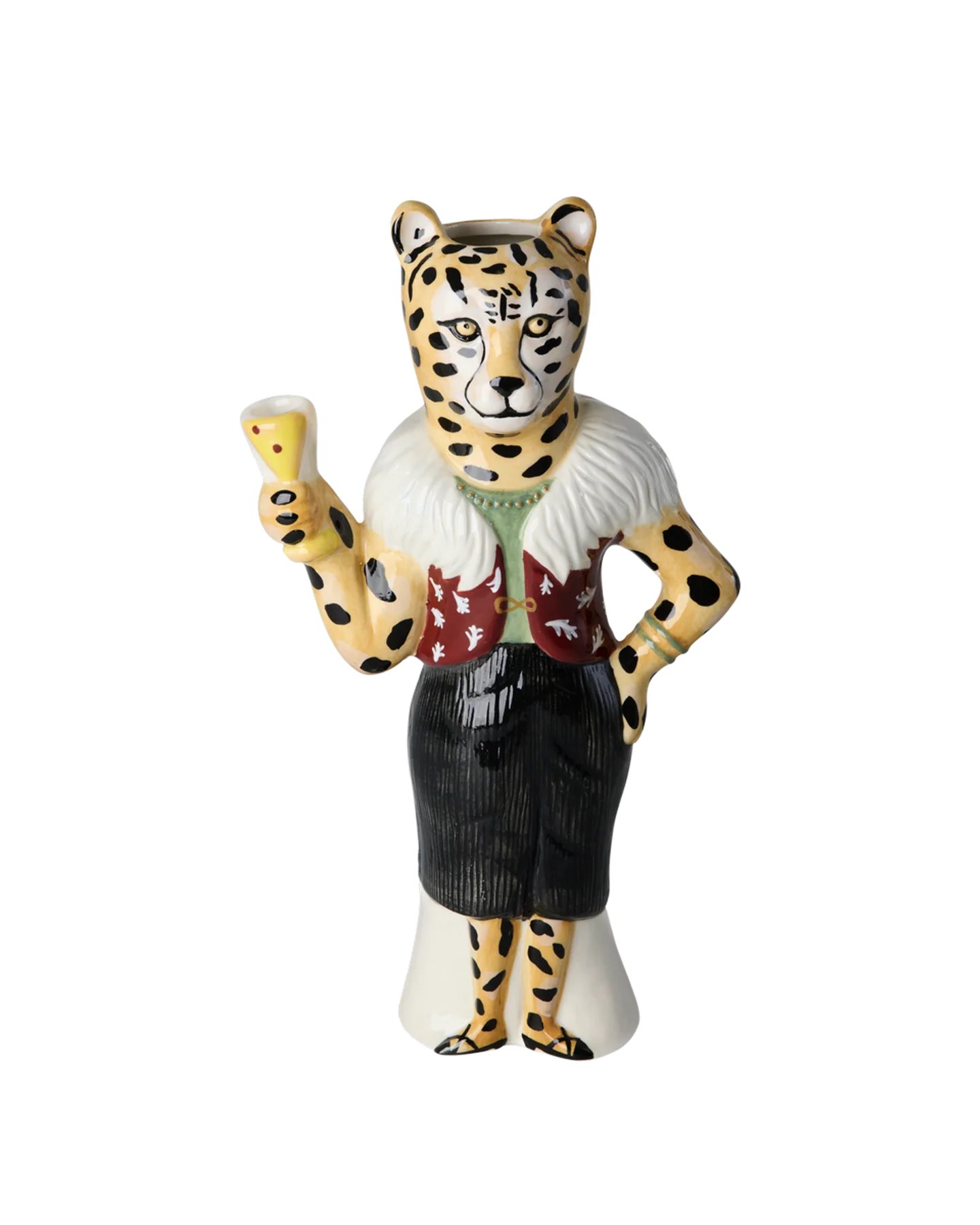 Oplev den fortryllende leopard vase fra Nathalie Lété i samarbejde med Rice. Denne unikke vase, der tager form som en cocktail-drikkende leopard, tilføjer et sjovt og farverigt element til dit hjem. Med sin karakteristiske stil vil den være et blikfang i ethvert rum, uanset om den pryder stuen eller vindueskarmen.