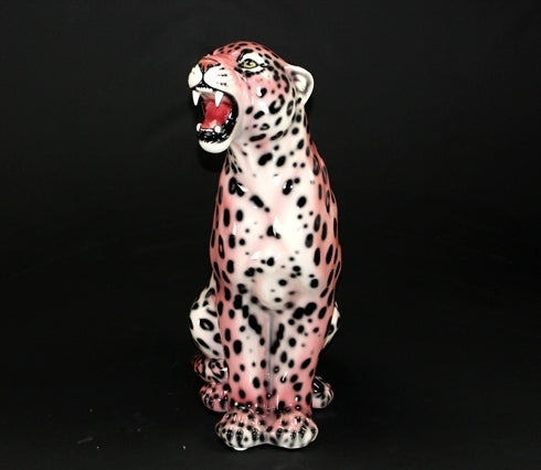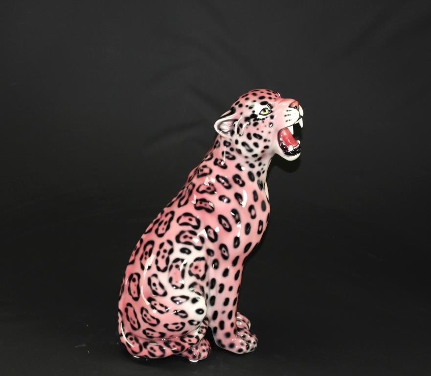 Den smukke Porcelænsfigur formet som en pink Leopard er fremstillet på en porcelænsfabrik i Italien. Leopardfiguren er fremstillet af porcelæn og måler 62 cm. Den skønne porcelænsfigur er håndmalet i smukke lyserøde nuancer med de flotteste detaljer, som får den flotte leopard til at fremstå virkelighedsnær. Leopardens åbne mund og skarpe tænder, giver samtidigt den unikke porcelænsfigur et iøjnefaldende og karakteristisk look. Den charmerende Porcelænsfigur vil derfor være et flot element til hjemmet, der mangler et cool og anderledes statement. Den pinke porcelænsfigur kan nærmest fremstå som et kunstværk eller en skulptur, med dens størrelse og farver.