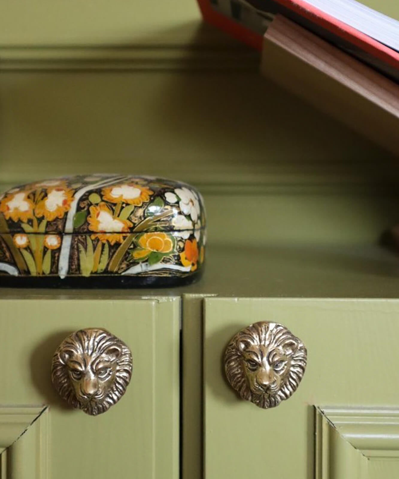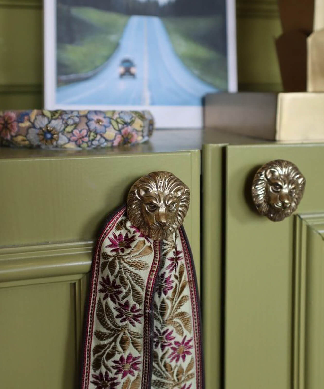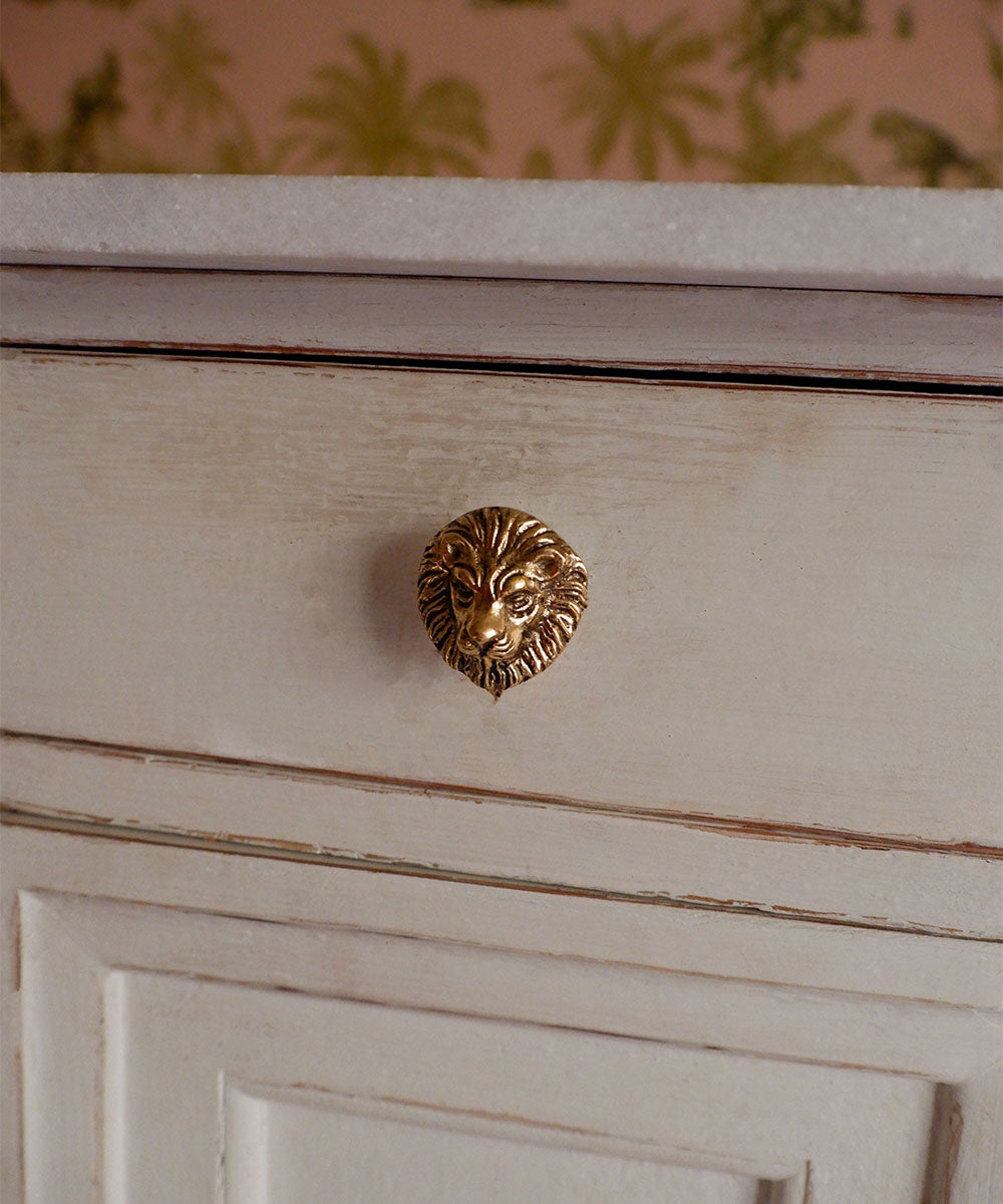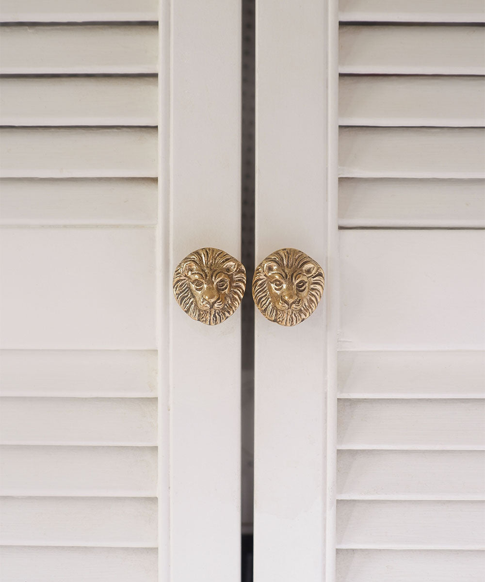 De skønne skabsknopper med løvehoveder er lavet i 100% genanvendt messing. Knagerne kan bruges på et skab, en dør eller som knage på væggen.