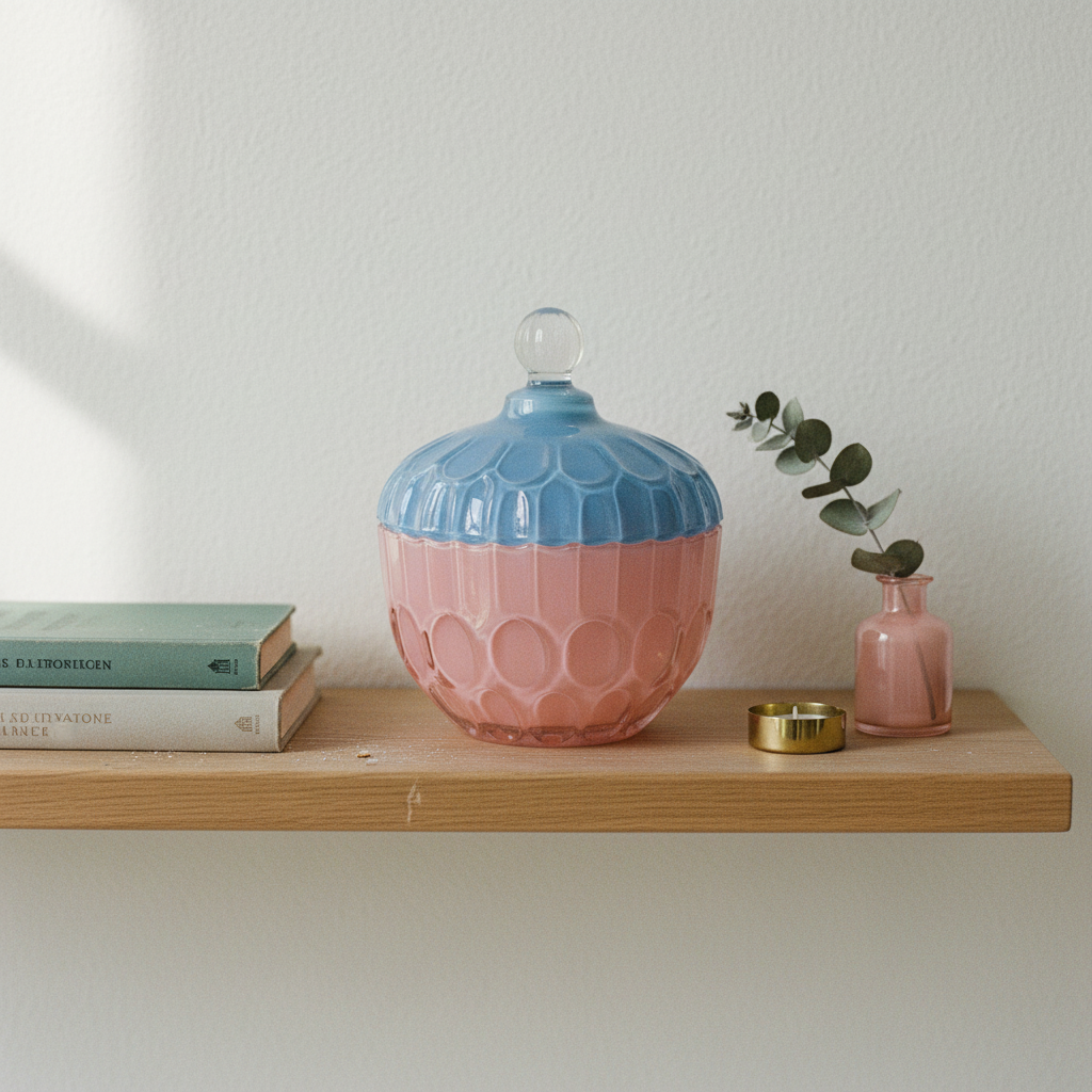 Stilfuld opbevaringskrukke i pink og blå nuancer