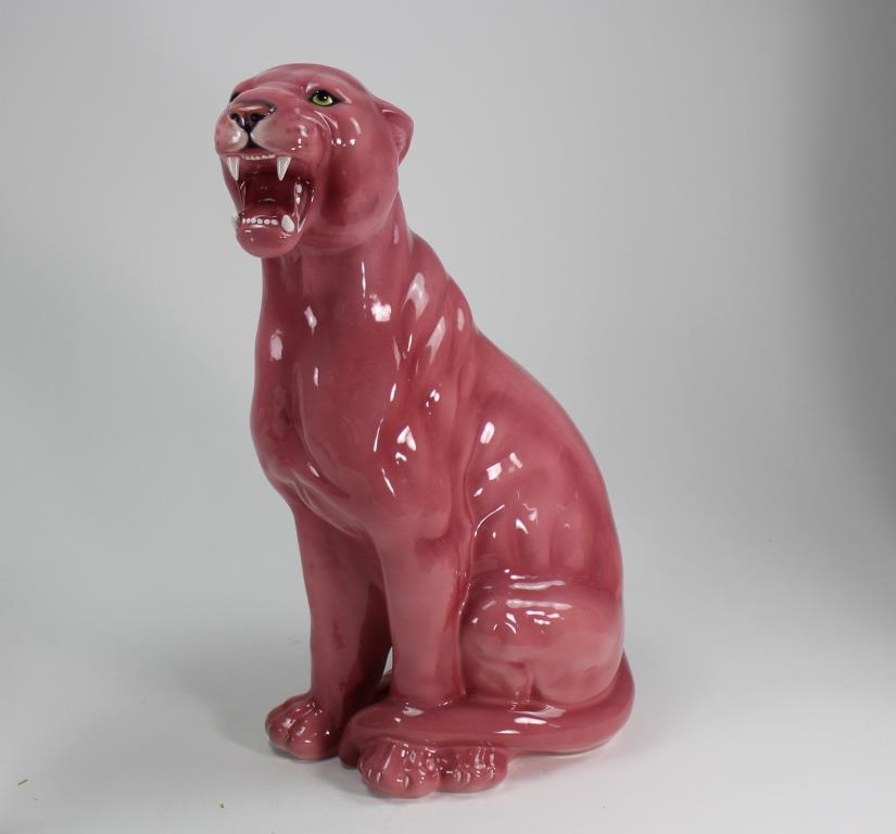 Denne imponerende porcelænsfigur af en pink panter er et markant indretningselement til hjemmet. Med sine 83 cm i højden er figuren håndmalet i Italien med omhyggelige detaljer, der giver et naturtro udtryk trods den utraditionelle farve. De lyserøde nuancer kombineret med den åbne mund og skarpe tænder skaber et karakteristisk udtryk.