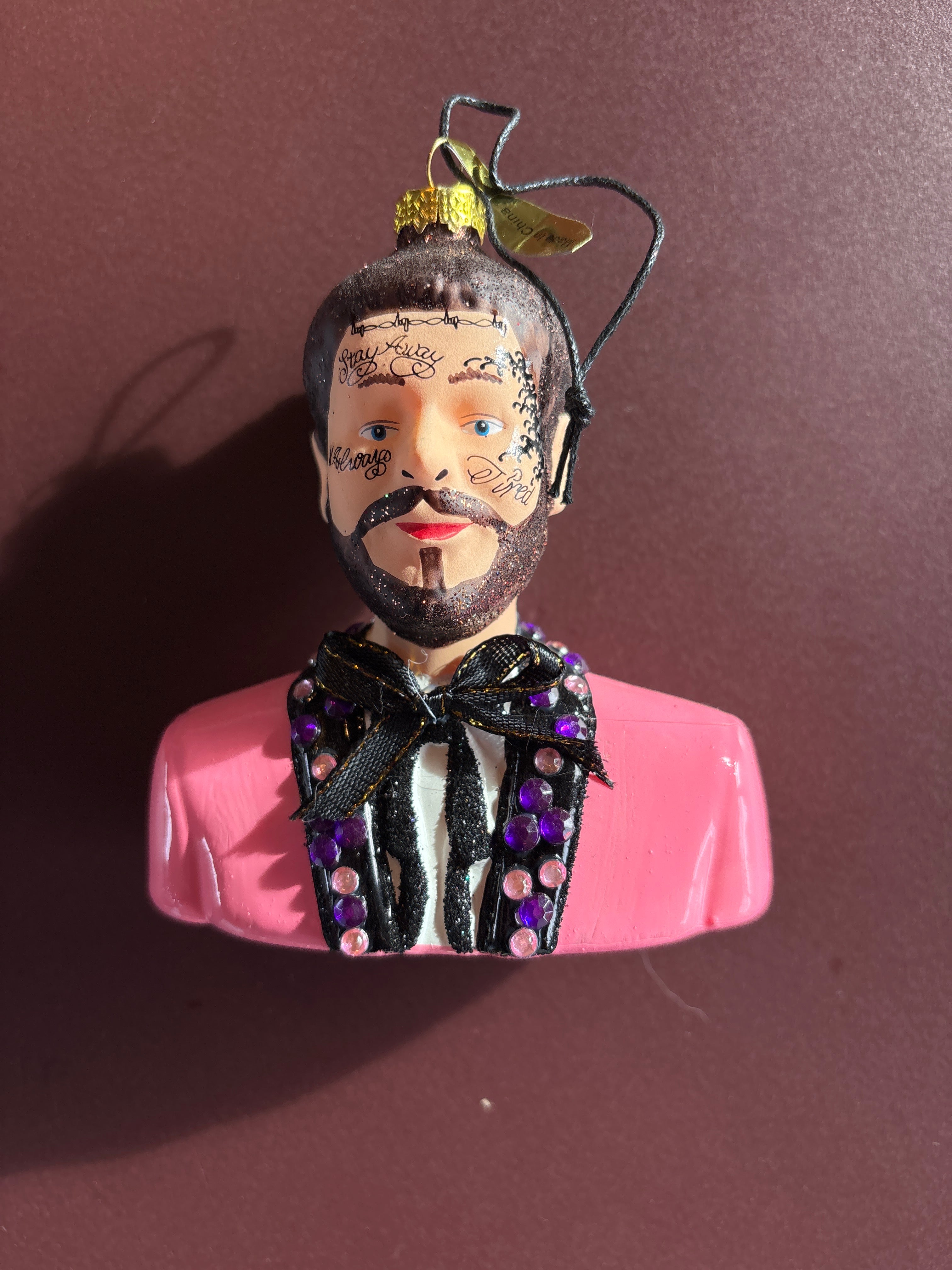 Dette ornament, inspireret af den populære amerikanske rapper og sanger Post Malone, tilføjer et sjovt og festligt element til din juleudsmykning. Med sit håndmalede design er hver kugle unik og bringer en kreativ flair til din juletræ.