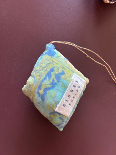 Ornamentet er fremstillet af overskudssilke fra produktionen af upcyclede silkevarer, hvilket reducerer ressourceforbrug og affald. De små variationer og eventuelle "fejl" som pletter eller løse tråde er ikke mangler, men autentiske tegn på materialets tidligere liv og det håndlavede arbejde.