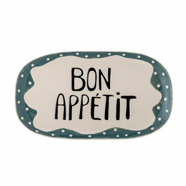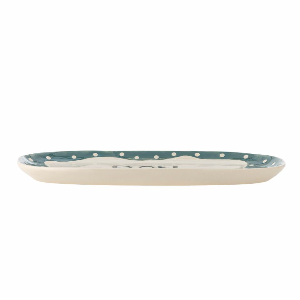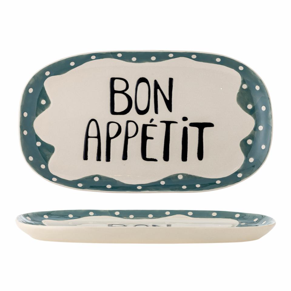 Dette smukke serveringsfad fra Bloomingville er en perfekt tilføjelse til enhver borddækning. Det håndmalede stentøj med teksten Bon Appétit i midten tilføjer et personligt præg, mens de bløde linjer og små prikker langs kanten gør fadet til en dekorativ detalje på dit spisebord.