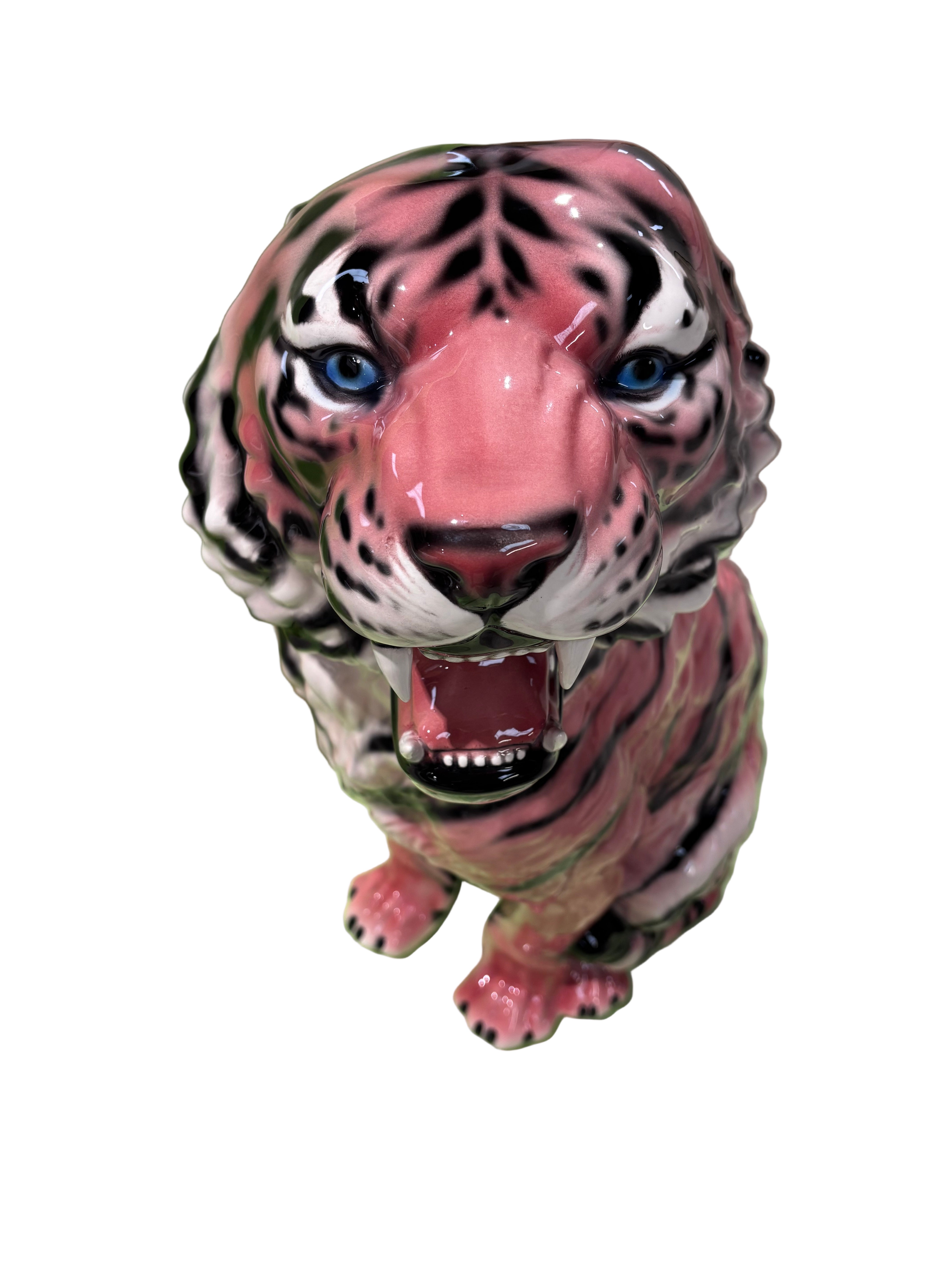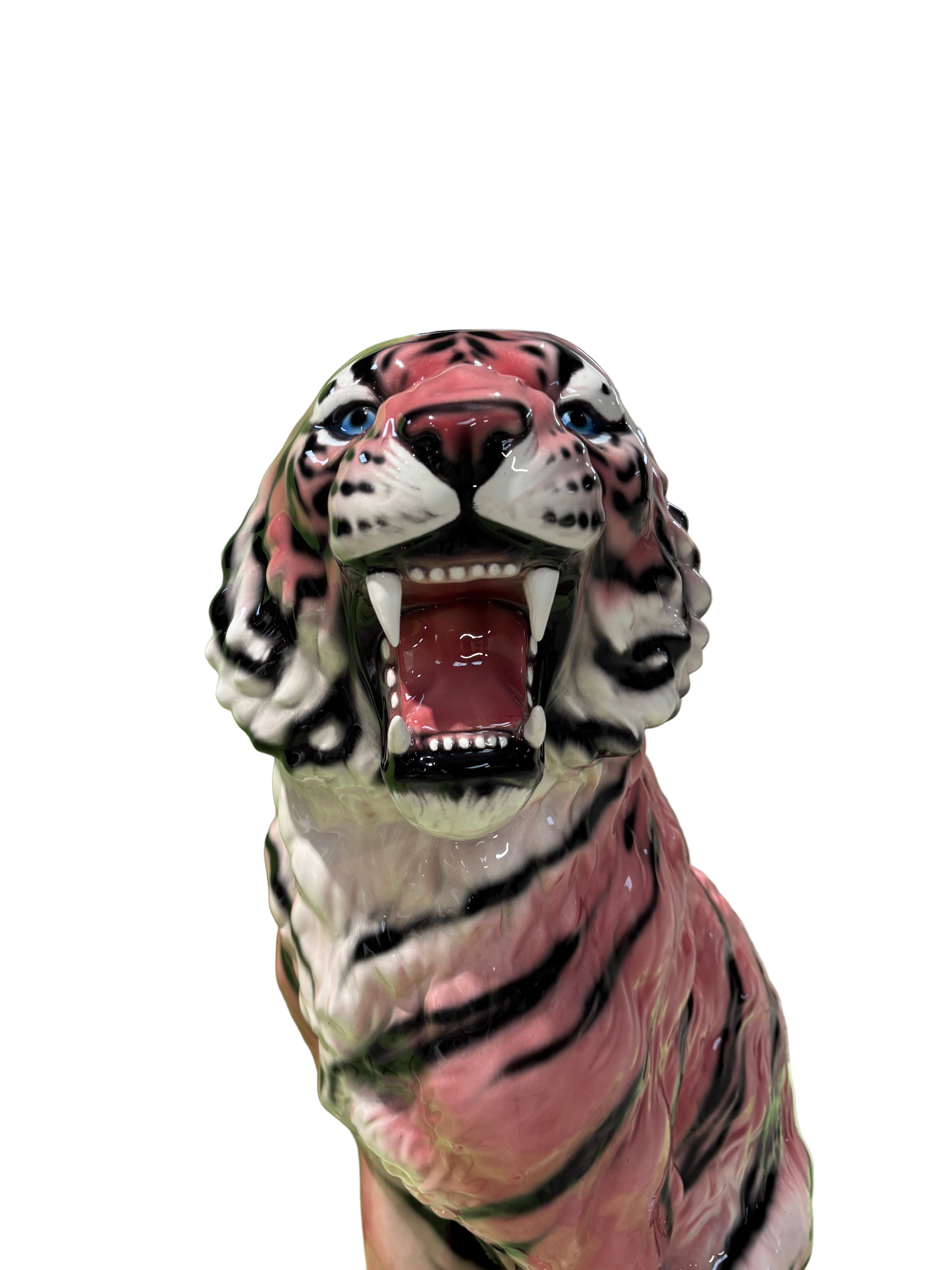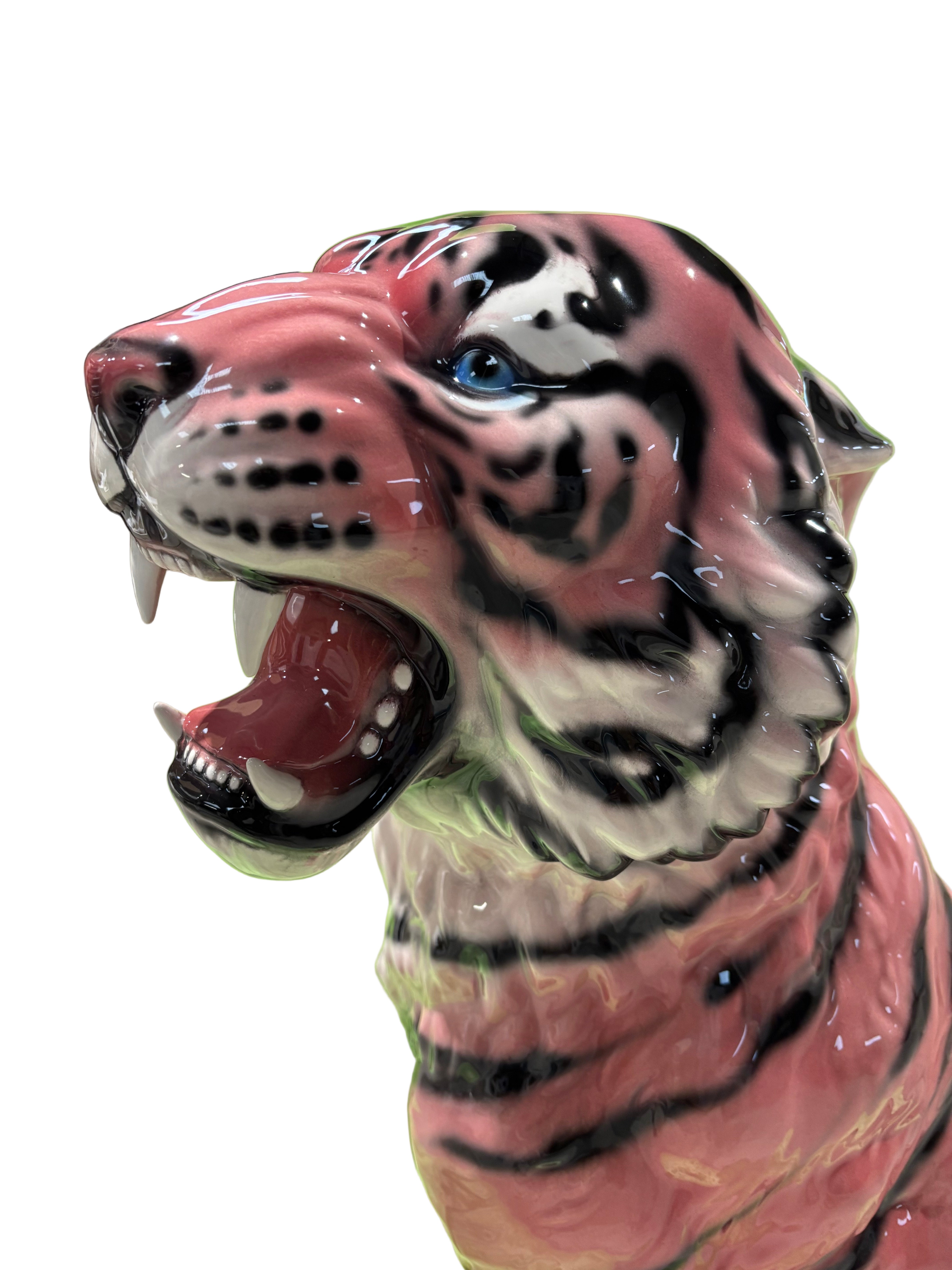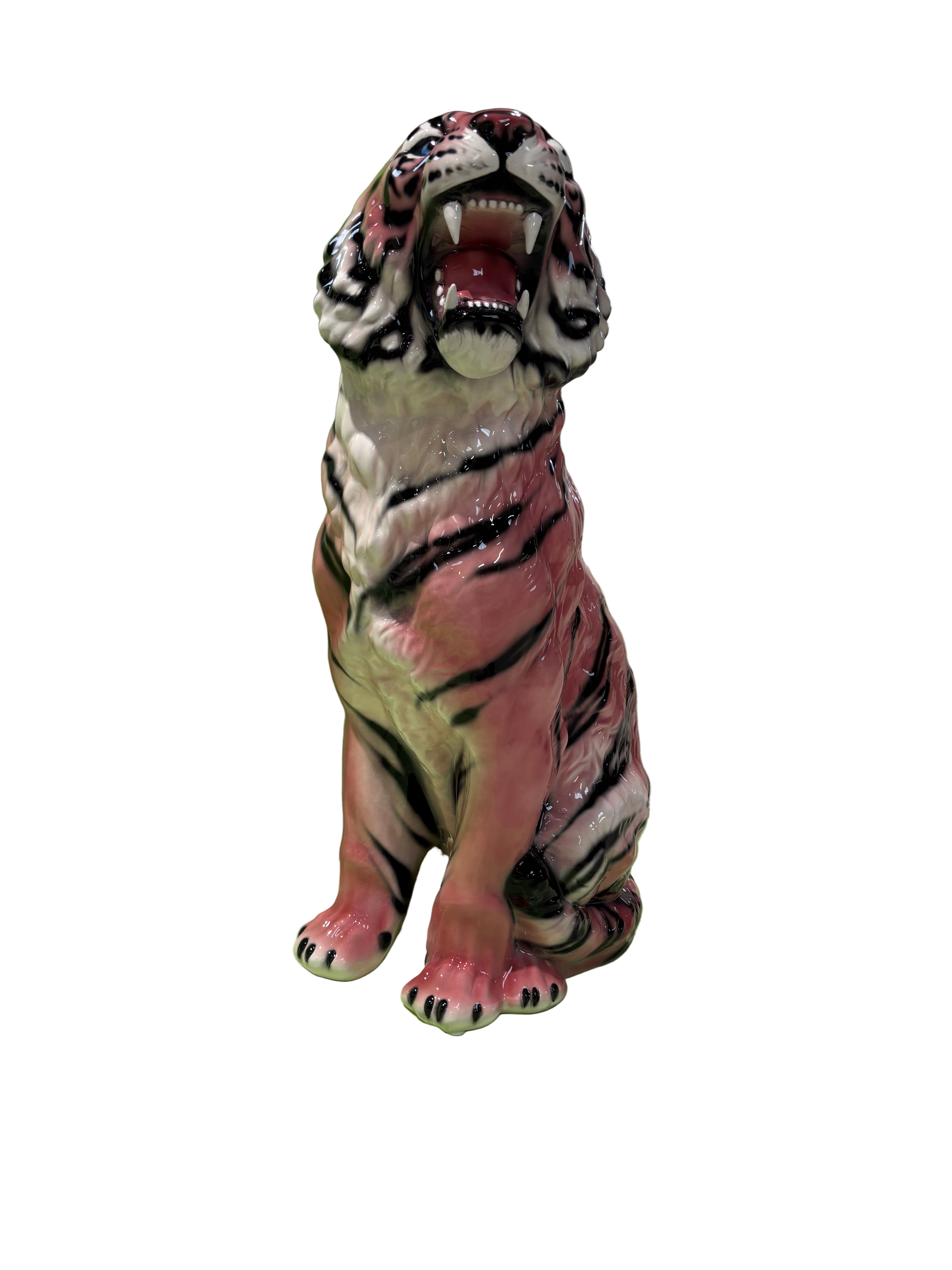 Denne imponerende 92 cm høje tiger figur er håndmalet på en italiensk porcelænsfabrik med minutiøse detaljer, der giver et autentisk og livligt udtryk. De omhyggeligt udførte striber og det karakteristiske ansigt med grønne øjne skaber en figur med karakter og personlighed. Hver tiger er unik med små variationer i det stribede mønster.