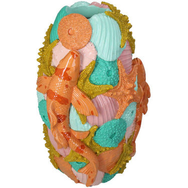 Med sin maritime form skiller denne vase sig ud fra traditionelle vaser og tilfører personlighed til ethvert rum. Den farverige fiskeform gør den til et naturligt blikfang, der kan stå alene som dekoration eller bruges til friske blomster. Polyresin-materialet sikrer både holdbarhed og mulighed for de detaljerede farver.