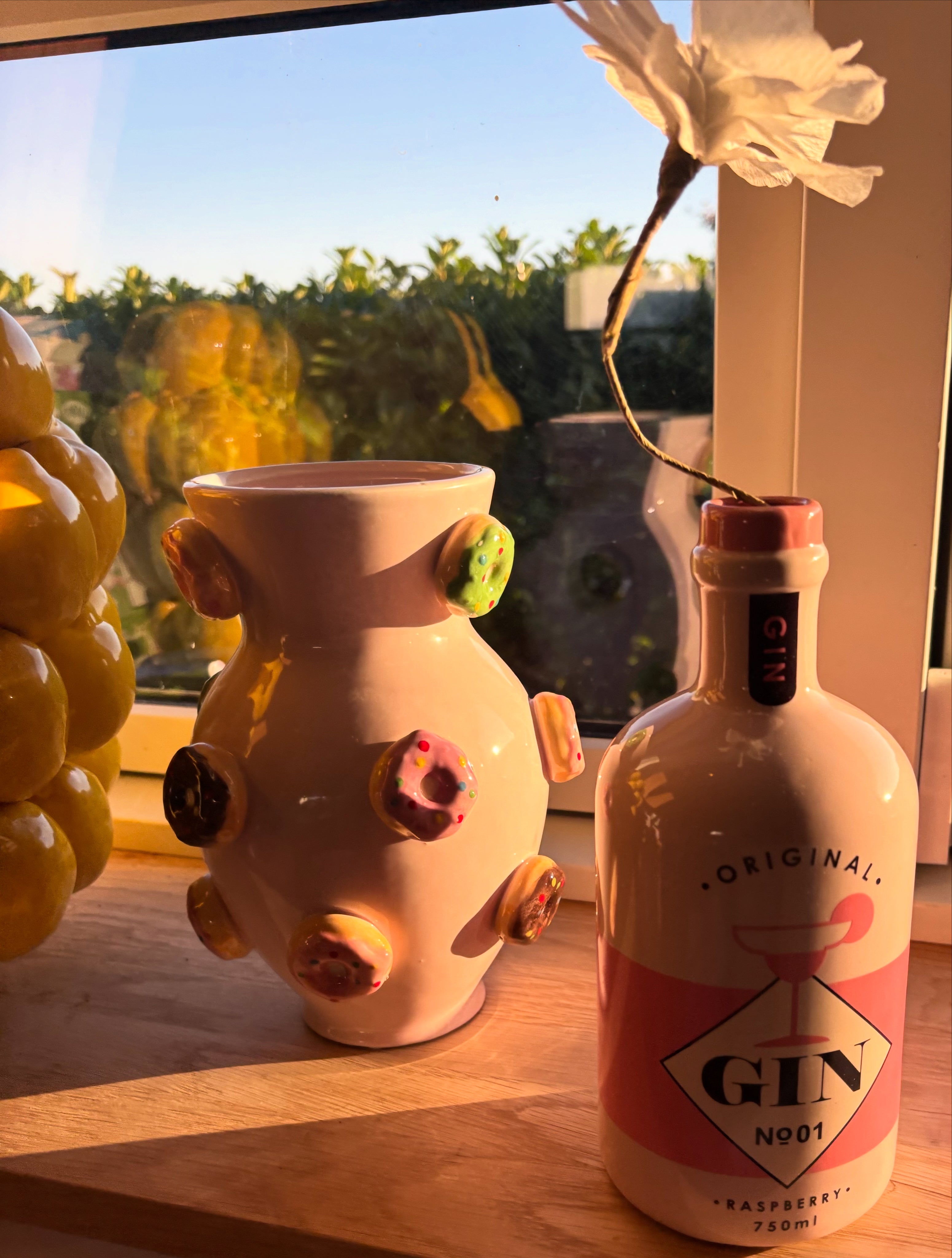 Lyserød vase med donut-motiv tilføjer et legende strejf til hjemmet